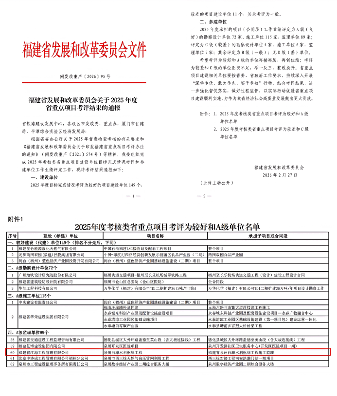 | 近期,福建省发展和改革委员会发布的《福建省发展和改革委员会关于2025年度省重点项目考评结果的通报》,福建省江海工程管理有限公司在泉州白濑水利枢纽工程项目监理过程中,凭借质量、安全、进度、合同管理及监理履职等方面表现突出,被评为“A级监理单位”。 福建省泉州白濑水利枢纽工程系国务院加快推进建设的172项重大水利工程之一,也是福建省在建单体投资最大的水利枢纽工程。该工程集供水、防洪、发电、生态提升于一体,总库容达5.44亿立方米,电站装机容量57兆瓦。 荣誉既是肯定,更是前行的动力。此次获评A级,不仅是对该工程建设成效的高度认可,更是对公司监理服务质量与综合实力的有力印证。福建省江海工程管理有限公司将坚持以“深学争优、敢为争先、实干争效”行动为纲领,持续强化监理团队的专业素养与技术能力,严格履行监理职责,紧盯工程质量、安全、进度等关键环节,以更高标准、更严要求、更实举措,为项目建设提供全方位、高质量的监理服务。